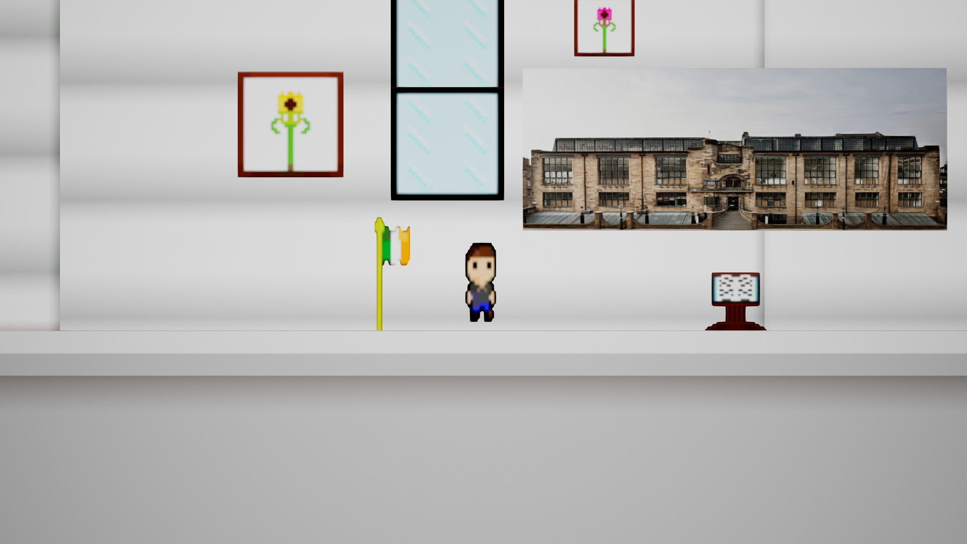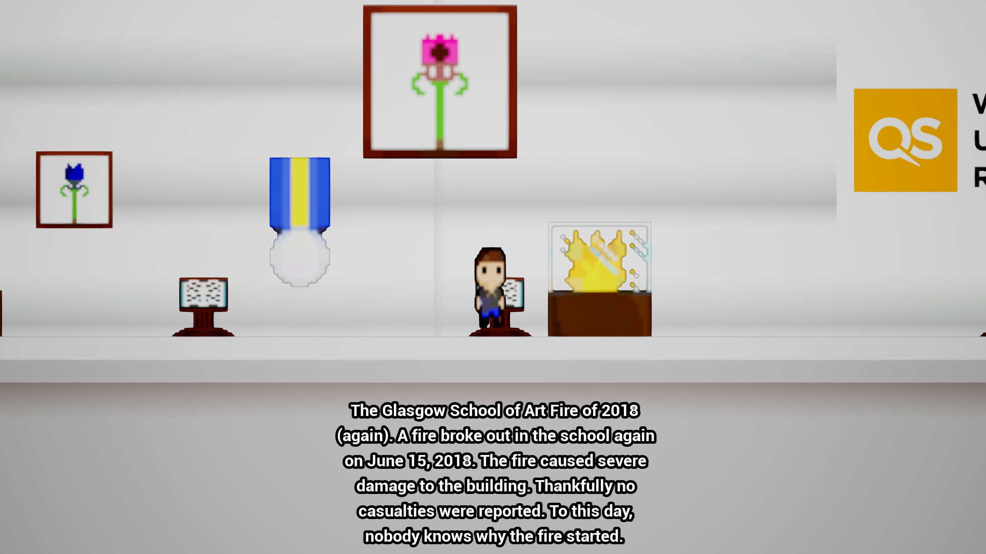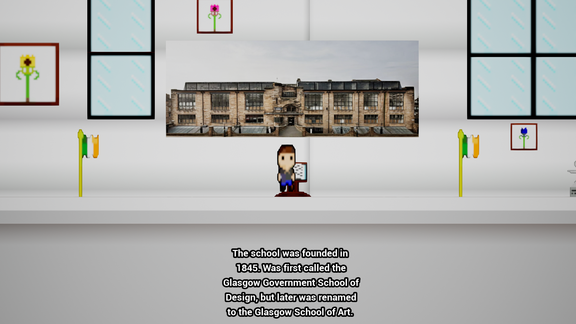 A single level 2D game where the player travels through the Glasgow School. As they go through the game, they will learn different facts and events about the school.